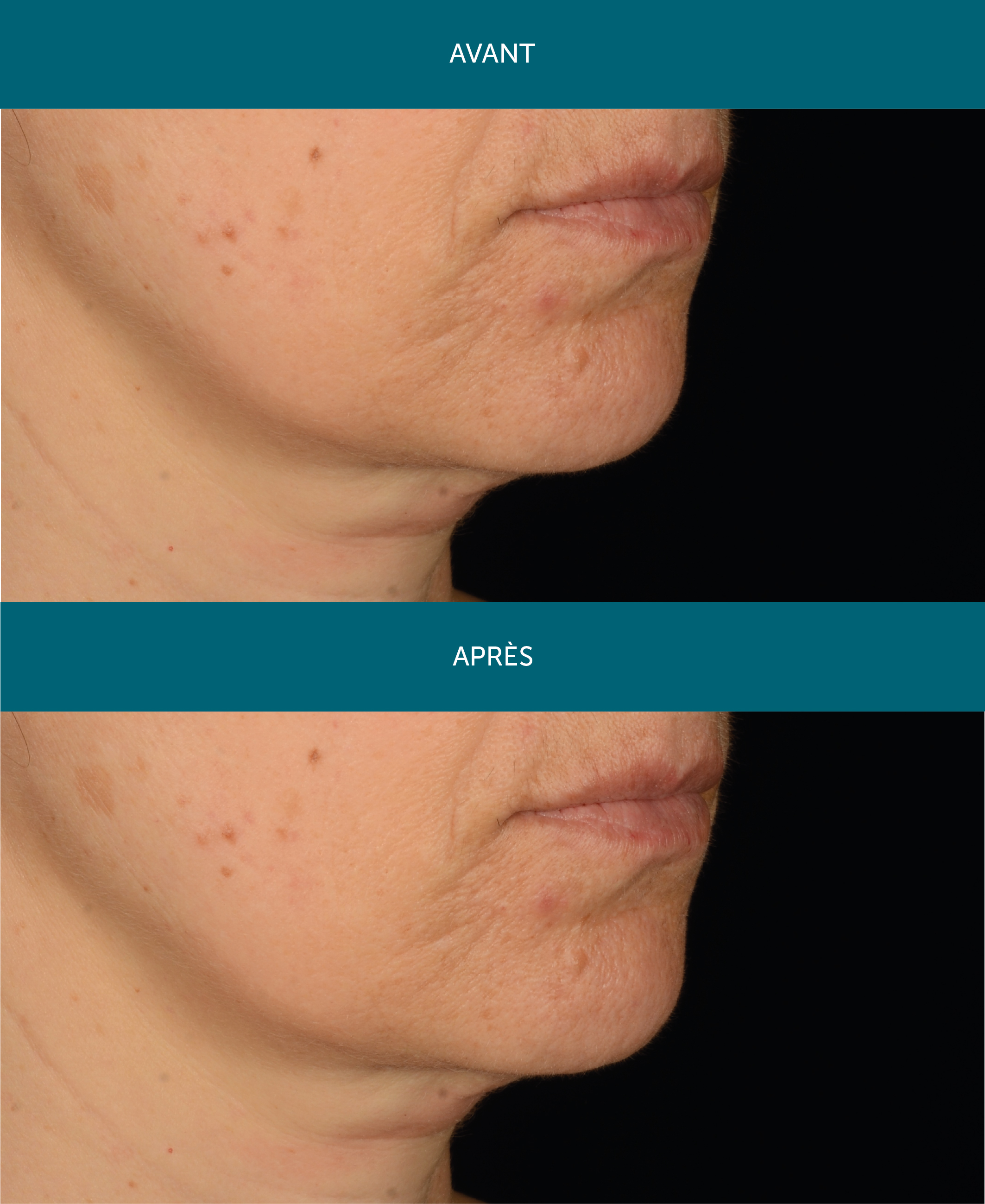 Photo avant/après d’une volontaire ayant reçu le soin professionnel raffermissant Silicium Lift réalisé avec l’accessoire Roller