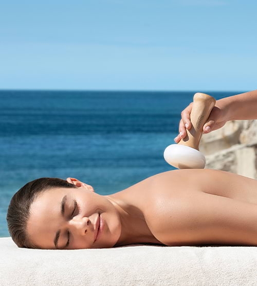 Une association parfaite entre un galet exclusif procurant une douce sensation de chaleur, rappelant la sensation d’un corps allongé sur une pierre gorgée de soleil, au Soin SPA-Marin du visage intégrant un enveloppement visage associant le Gel Plasmalg et les Algues-Micro Éclatées.
